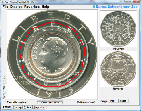 Click on the "View coin size" button to see how large the selected coin type is in comparison to a U.S. dime, cent, nickel, quarter, half, and large dollar. Exact change displays the red outline in the correct proportion and correct shape. The actual dimensions are displayed along the left side of the screen. Dimensions for most of the world coins are not available from anywhere else, either in print or software. |